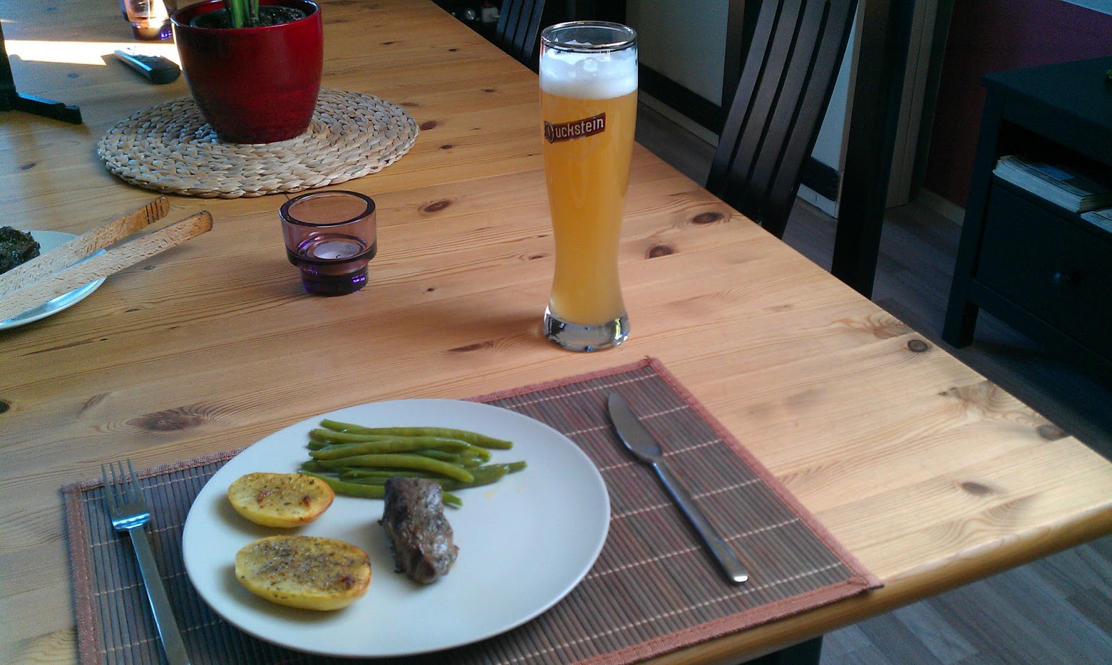 Vollkommen zufrieden mit mir habe ich mir heute noch etwas schönes gegönnt: Lammsteaks vom Grill, dazu Rosmarinkartoffeln und grüne Bohnen. Das ganze an PINKUS Weizenbier.